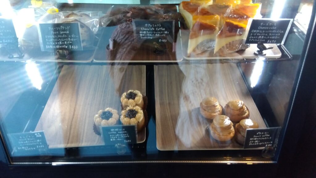 - 生菓子: エクレア(人気)、モンブラン(¥780)、チーズケーキ(¥670)、カフェショコラ(¥580)、珈琲ムース(¥690)、プチコーヒー(¥390)など