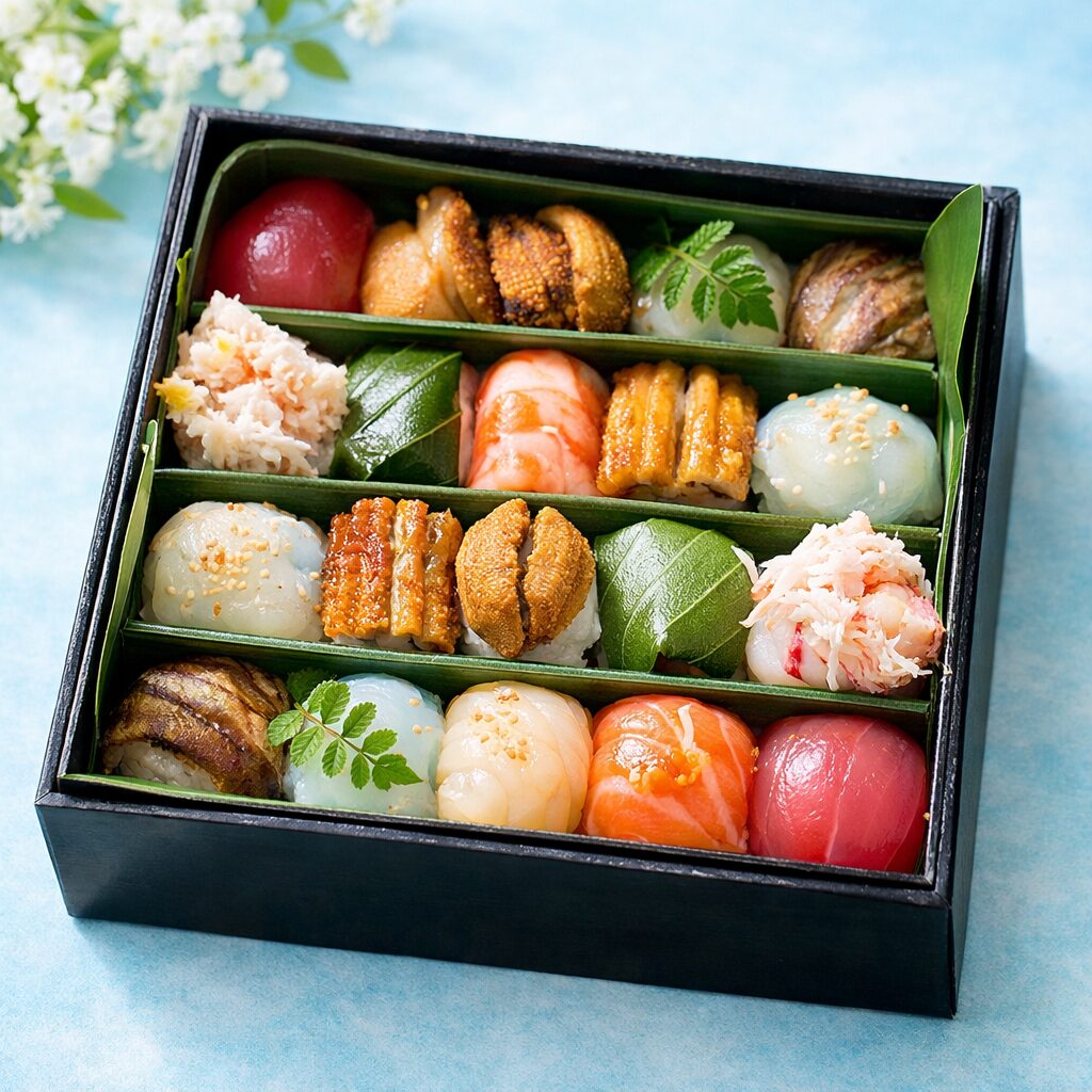 京都らしい可憐な美しさを愉しむなら、こちらの手毬寿司がおすすめです。 職人の手仕事が光る、ころんと丸い一口サイズ。一貫ごとに丁寧に施されたあしらいが、お祝いの席や春の行楽を華やかに彩ります。お箸を使わずとも食べやすく、女性やお子様とのひとときにも喜ばれる逸品です。