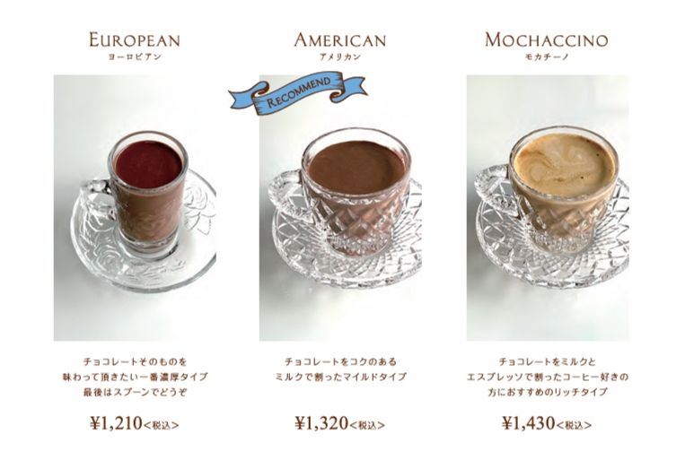 濃厚なチョコレートの風味を堪能したい方には、カカオの塊を溶かしながら飲む『EUROPEAN(ヨーロピアン)』(¥1,210)もおすすめです。一方、エスプレッソと組み合わせてコーヒーの風味も楽しみたい方には、クリーミーな泡立ちの『MOCHACCINO(モカチーノ)』(¥1,430)がぴったりです。