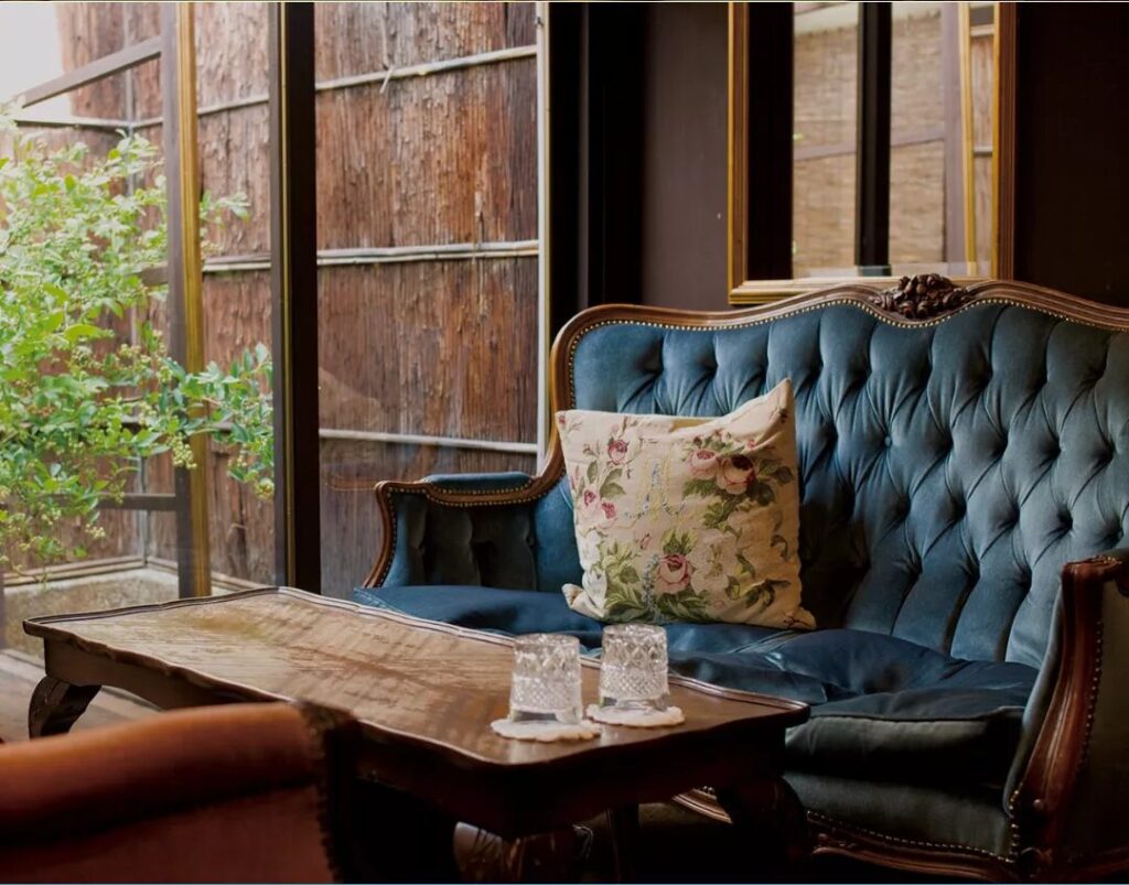 - 空間の贅沢: 築100年の京町家の静けさと鮮やかなコバルトブルーが織りなす非日常のコントラスト。