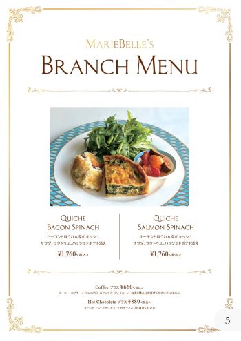 ブランチメニュー: Cacao $\text{Bar}$らしい「キッシュ」または「エッグベネディクト」をブランチとして楽しむこともでき、滞在の幅を広げます。