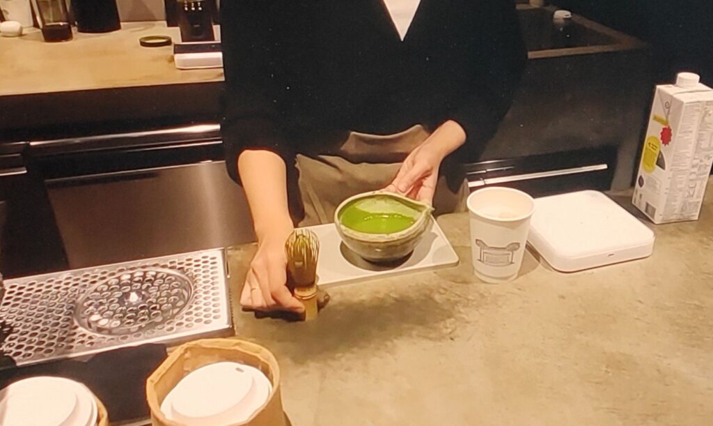 私は娘のIchiyoと抹茶ラテを購入しました。目の前でお抹茶を点ててからオーツミルクで仕上げられた 抹茶ラテは、お抹茶の旨味がしっかり感じられる飲みごたえのある美味しいドリンクでした。私たちはこのドリンクを、テイクアウト形式(長居はできないスタイル)の坪庭の片隅にある木椅子で心ゆくまで堪能しました。