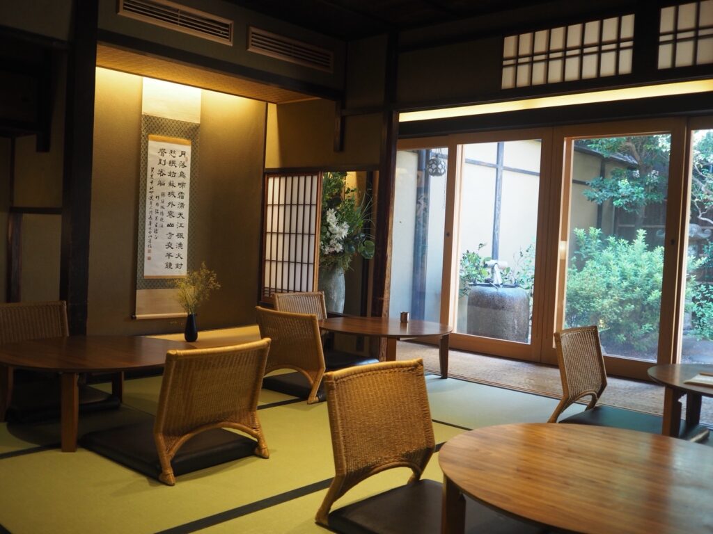 風情ある京町屋をベースにした温かみのある空間。格子戸や木の梁が残されていて、京都らしい落ち着きとモダンさが共存しています。窓から差し込む光が柔らかく、朝の時間帯は特に気持ちよく過ごせます。カウンター席とテーブル席に加え、お店の奥には畳席のお部屋もあり、一人でもグループでも利用しやすいです。