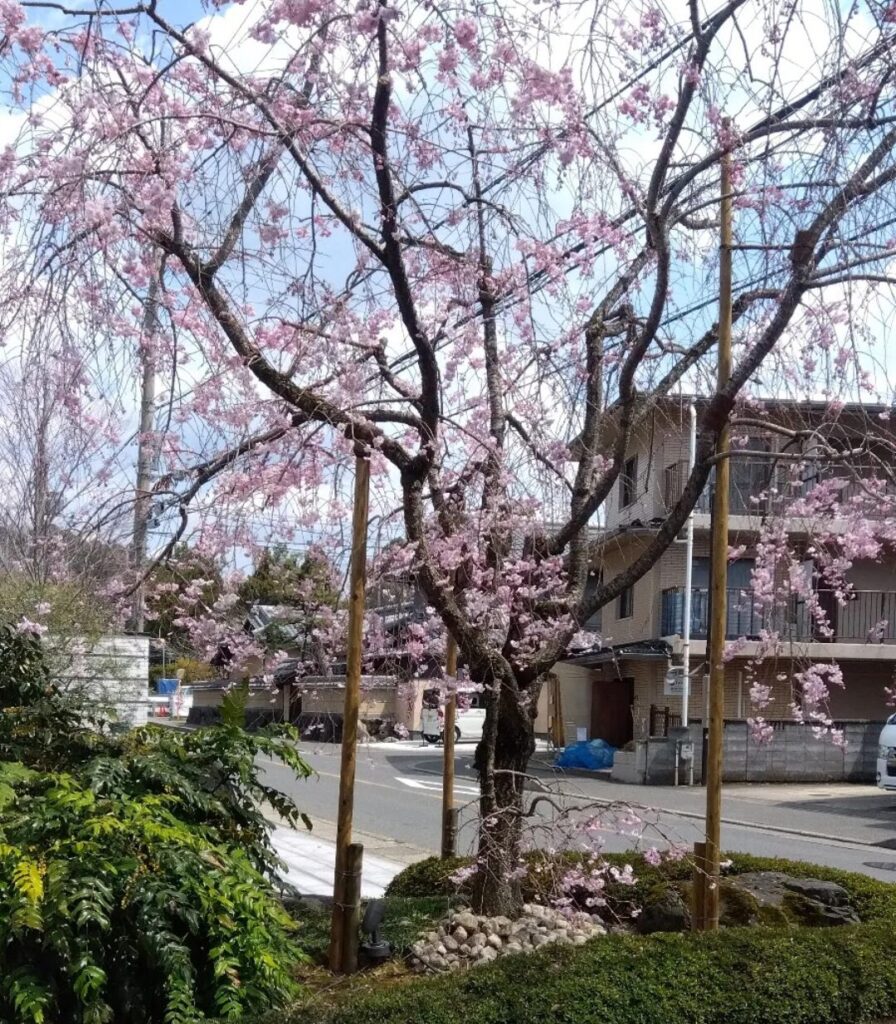 見守りの対象に選んだのは、名所の大木ではなく、上賀茂の静かな住宅街にある、立派な豪邸の玄関の門前に凛と立つ見事な一本桜です。